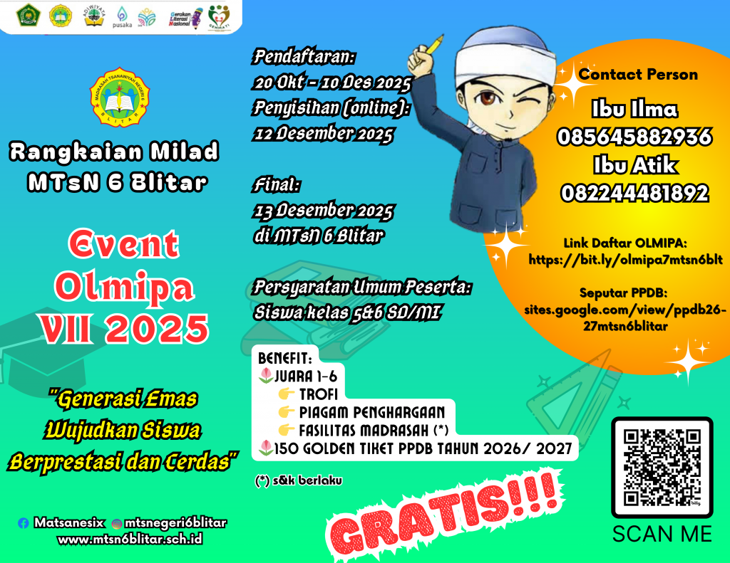 Dalam rangka Milad MTsN 6 Blitar, kami mengundang seluruh siswa kelas 5 dan 6 SD/MI untuk berpartisipasi dalam ajang bergengsi: